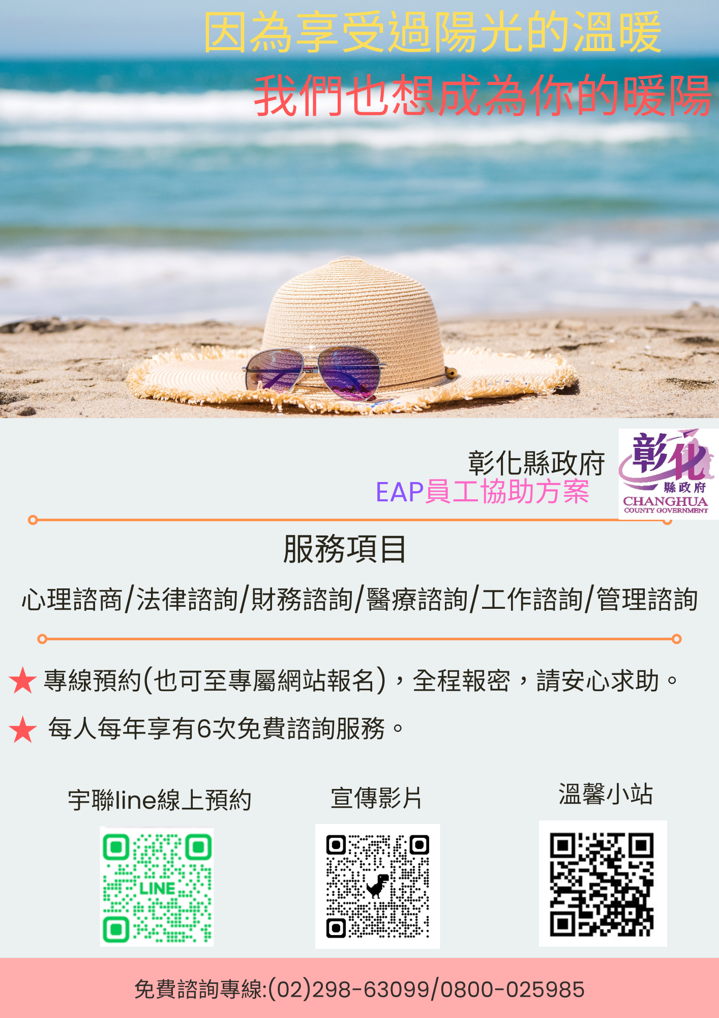 | 一、 | 彰化縣政府115年委託專業機構宇聯管理顧問有限公司,提供心理、醫療、財務、法律、工作及組織管理等六大面向專業諮詢服務。同仁如有使用需求可撥打EAP專線(02-29863099、0800-025985) 、透過溫馨小站(https://sites.google.com/view/changhuaeap)預約或由縣府人事處EAP窗口協助(04-7531412)。 |
